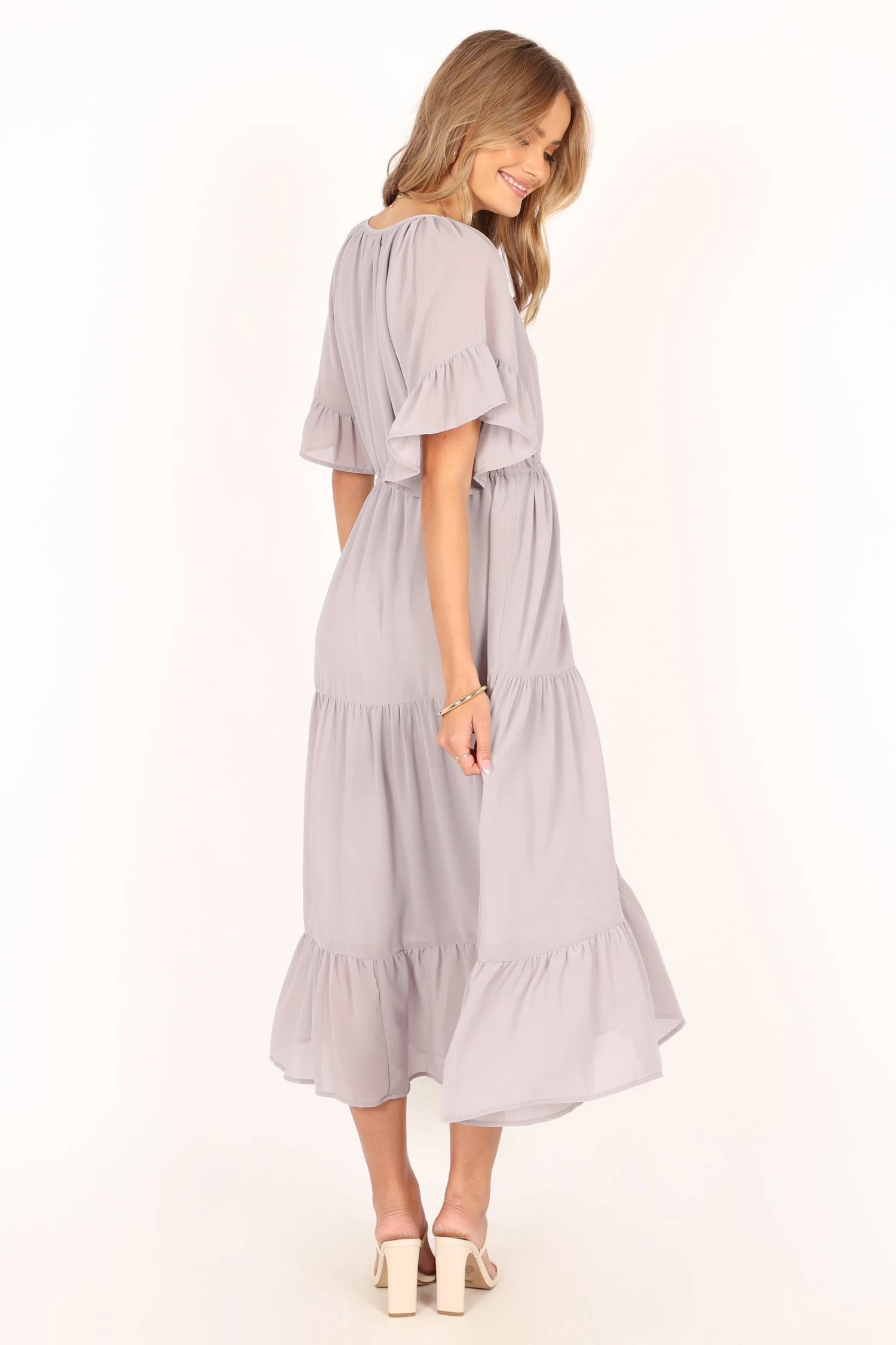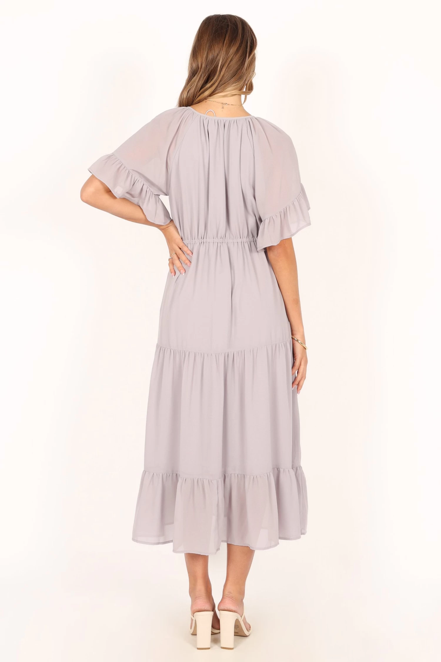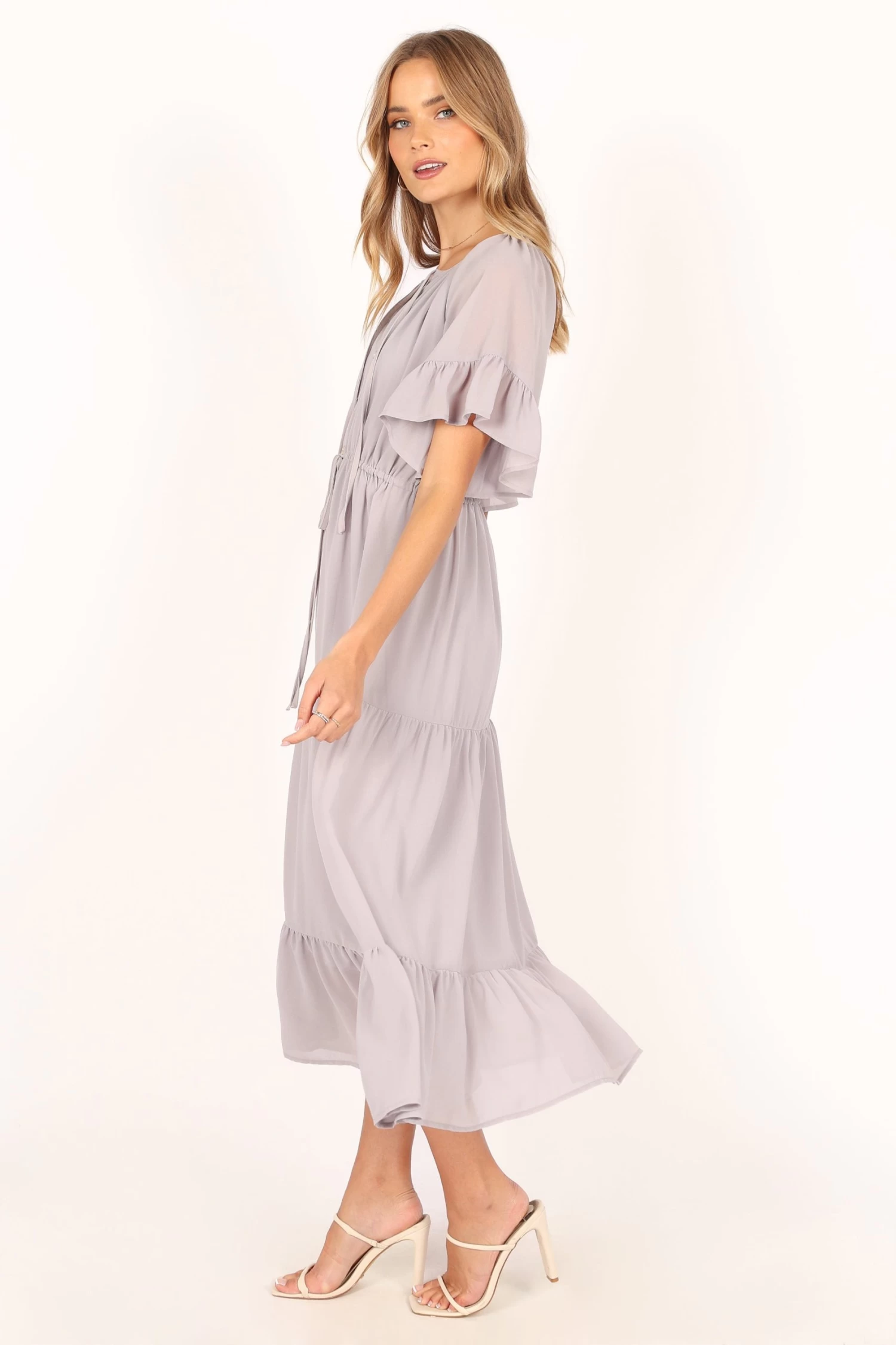 | DETAILS Dress to impress with this beautiful midi dress! Featuring a romantic v neckline with adjustable tie detail, short sleeves with statement ruffle feature and front functional button closure. This easy pull on design is complete with draw string waist closure for a perfect fit.