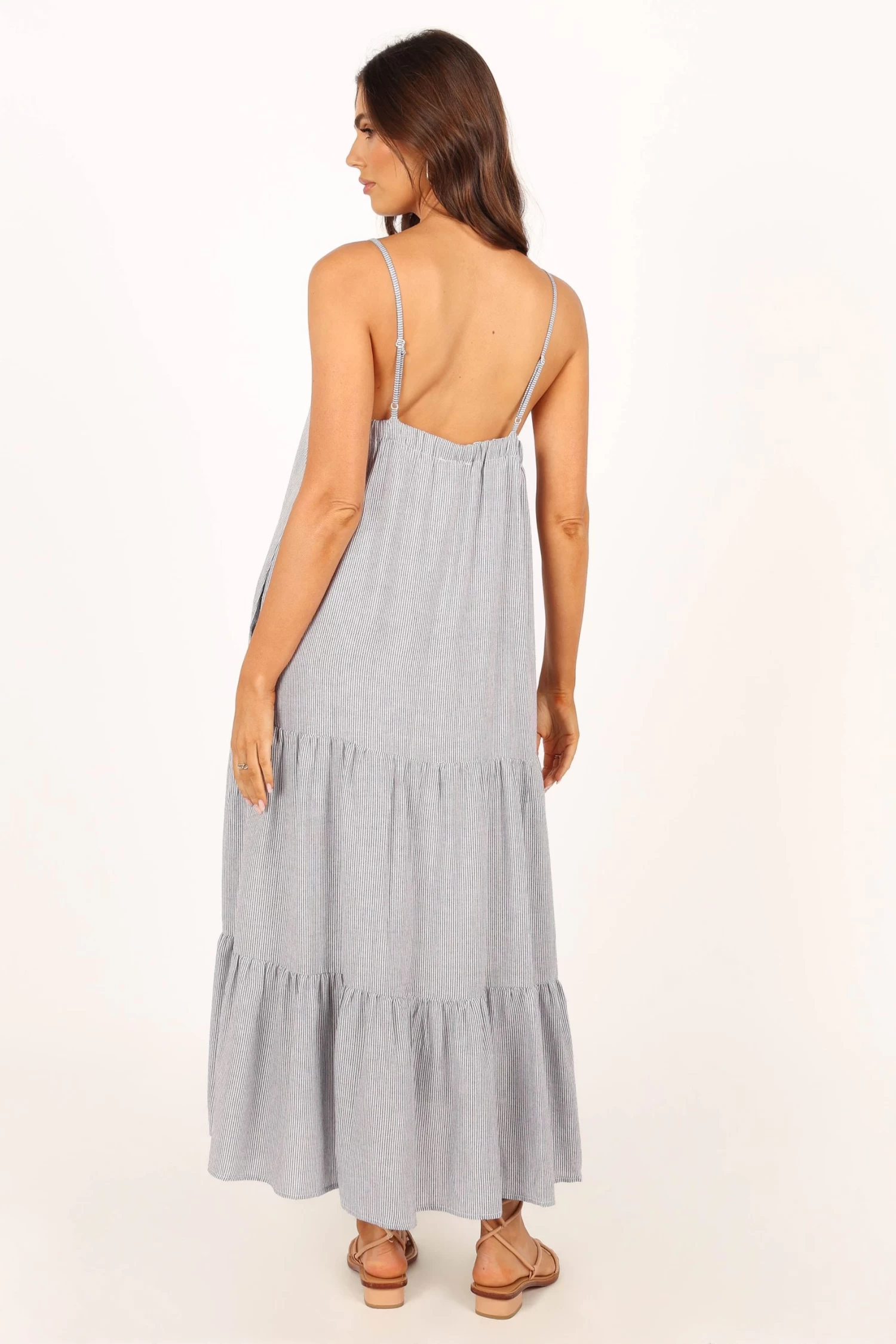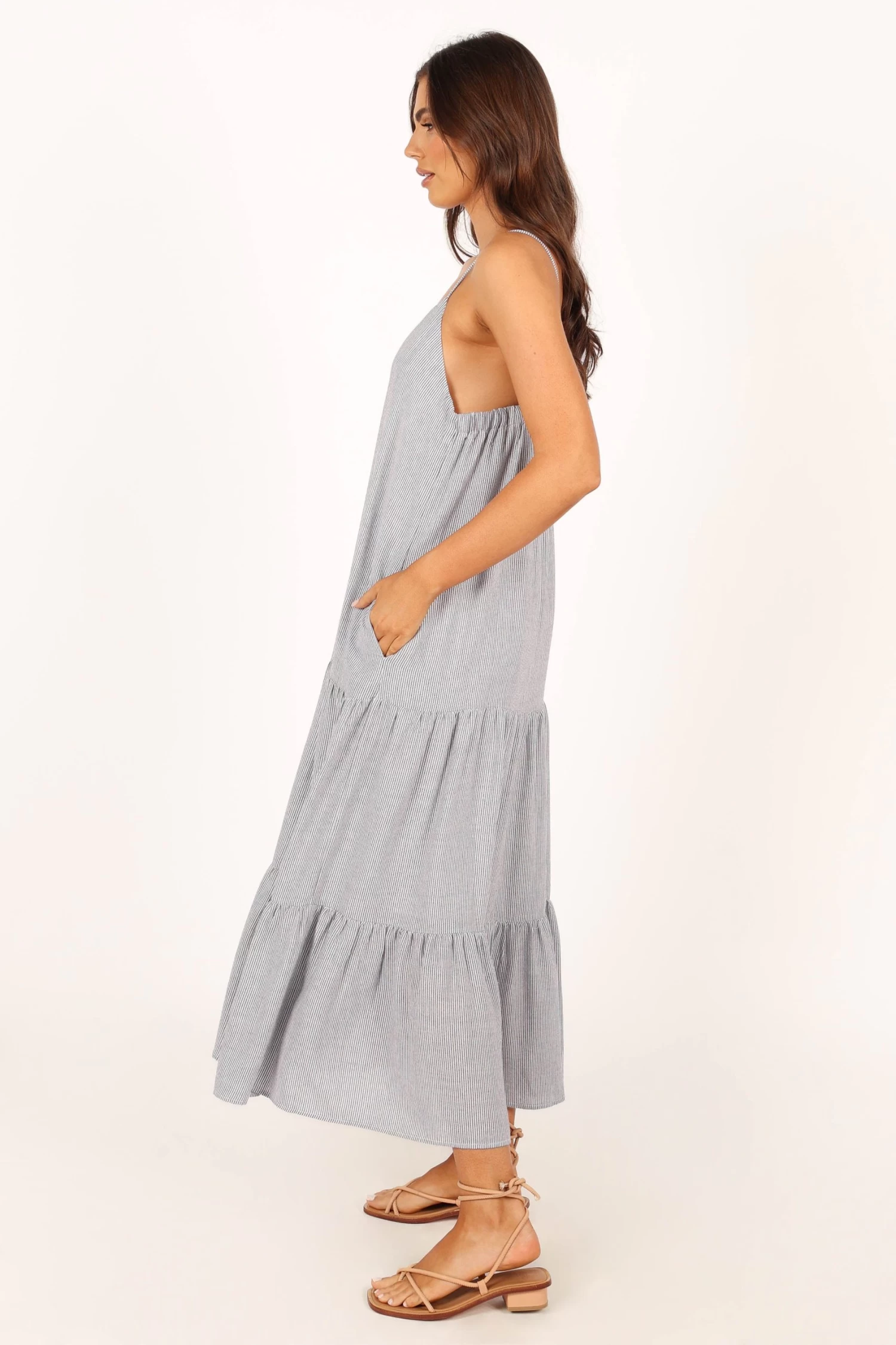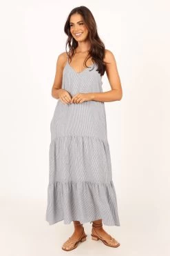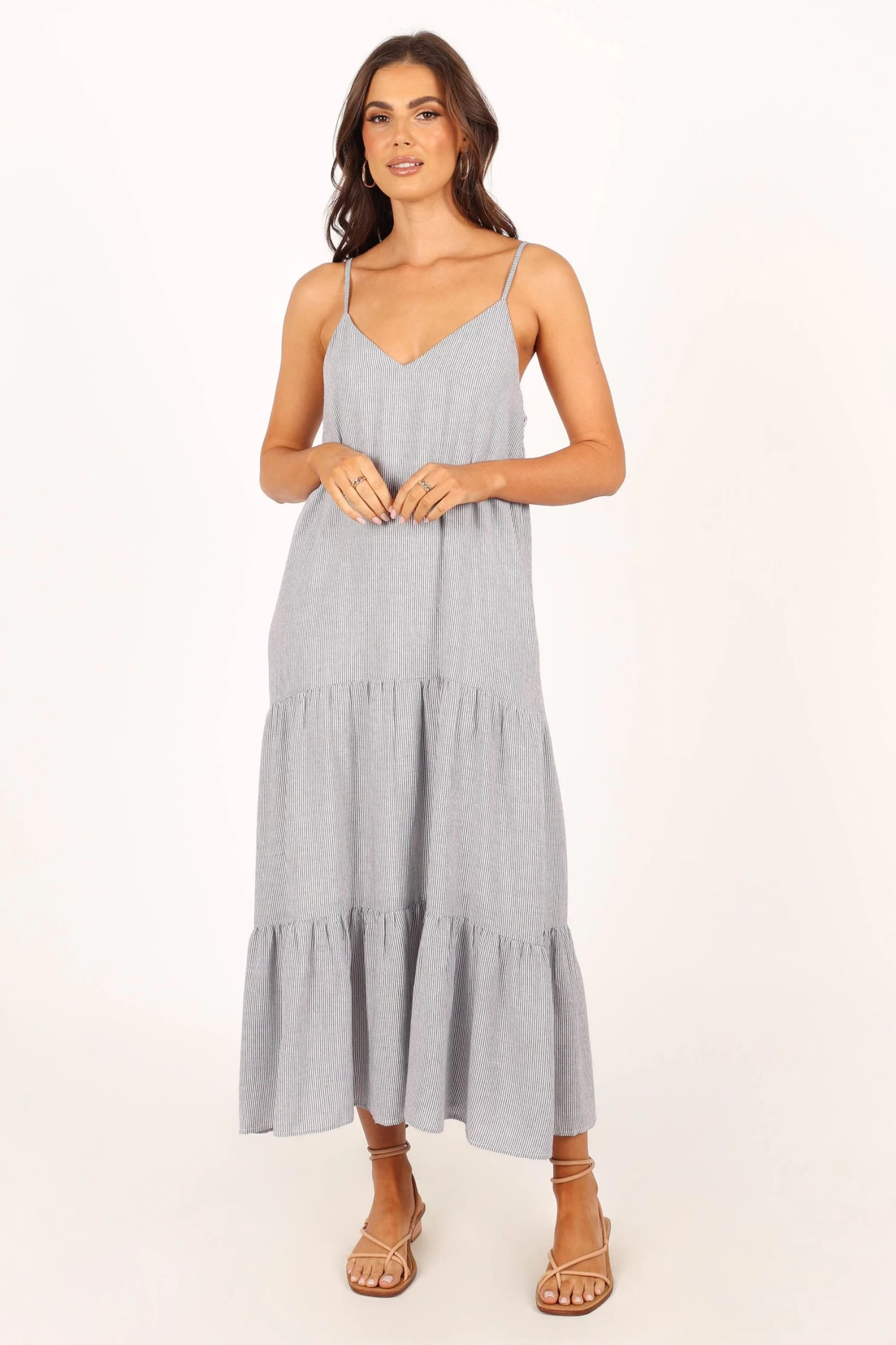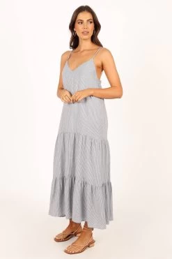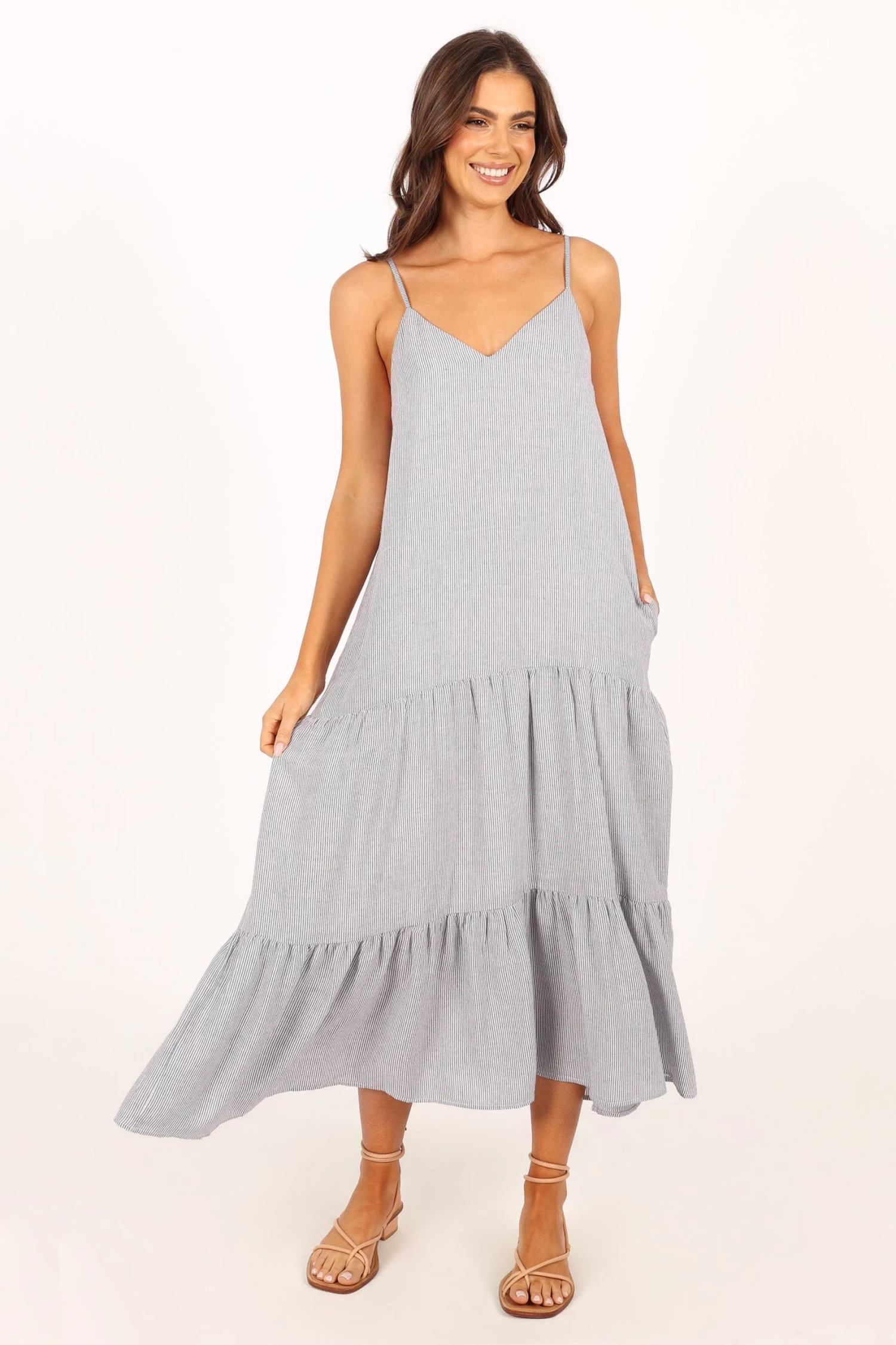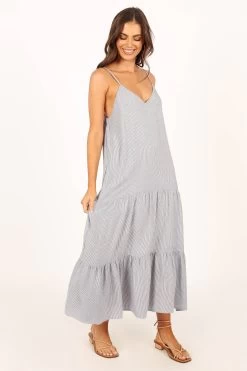 | DETAILS Step up your summer style with this relaxed fit midi dress! This timeless piece features a v neckline, thin adjustable straps, and an elasticised band at the back for comfort. Its pull on design makes it easy to wear, and its stripe print adds a touch of fun.