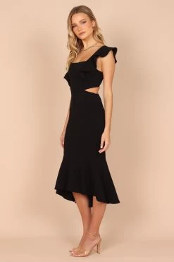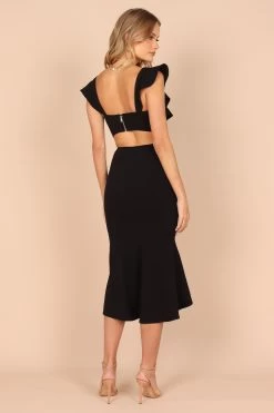 | DETAILS It’s time to turn heads and let your style shine! Introducing our bodycon midi dress featuring a statement square neckline, frill shoulder detail, waist cut out feature and invisible side skirt zip.